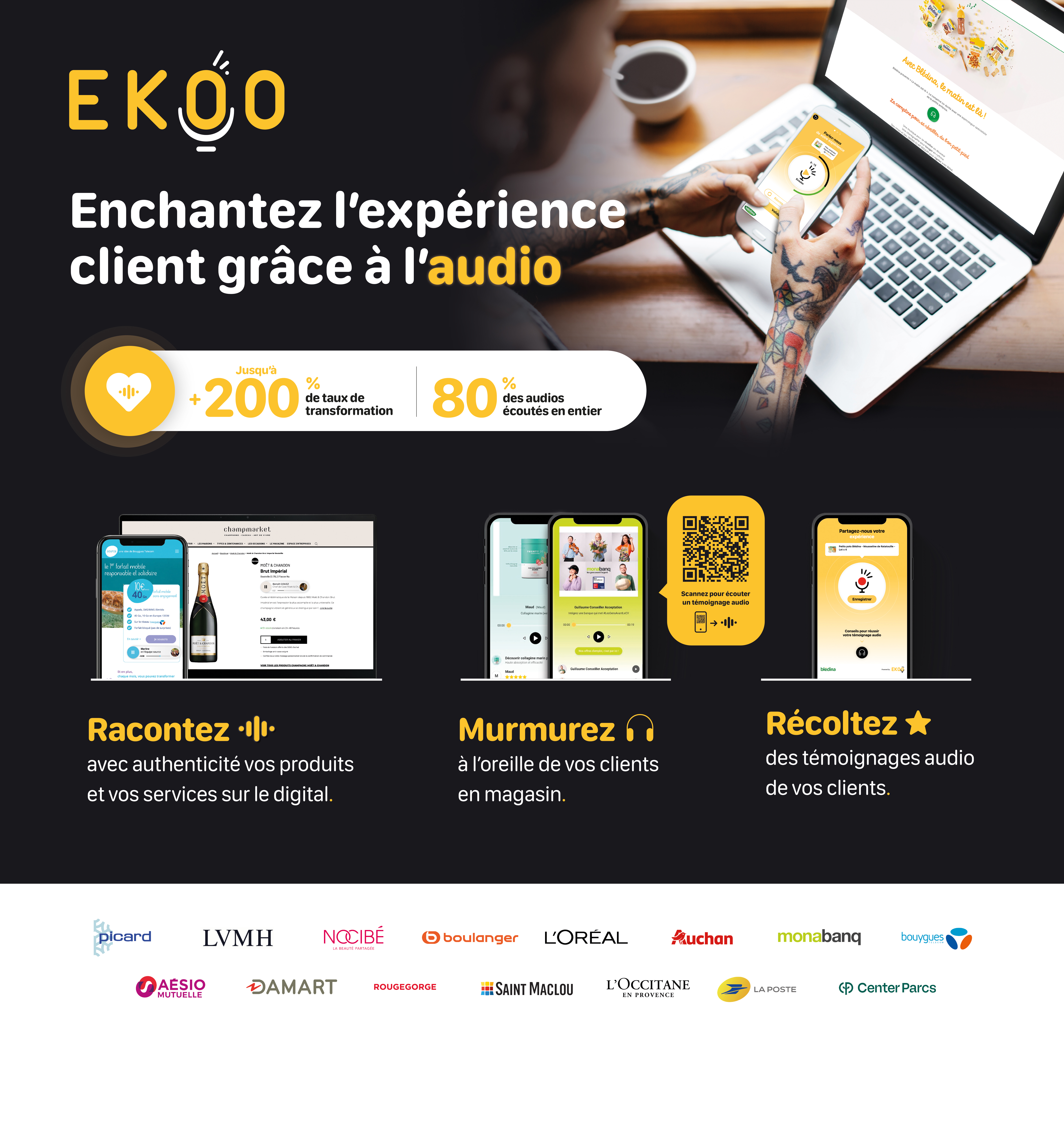 La solution Ekoo permet également de recueillir des feedbacks vocaux de ses clients. Ceux-ci peuvent vous servir pour améliorer votre expériences ou peuvent être mis en ligne pour séduire d'autres clients